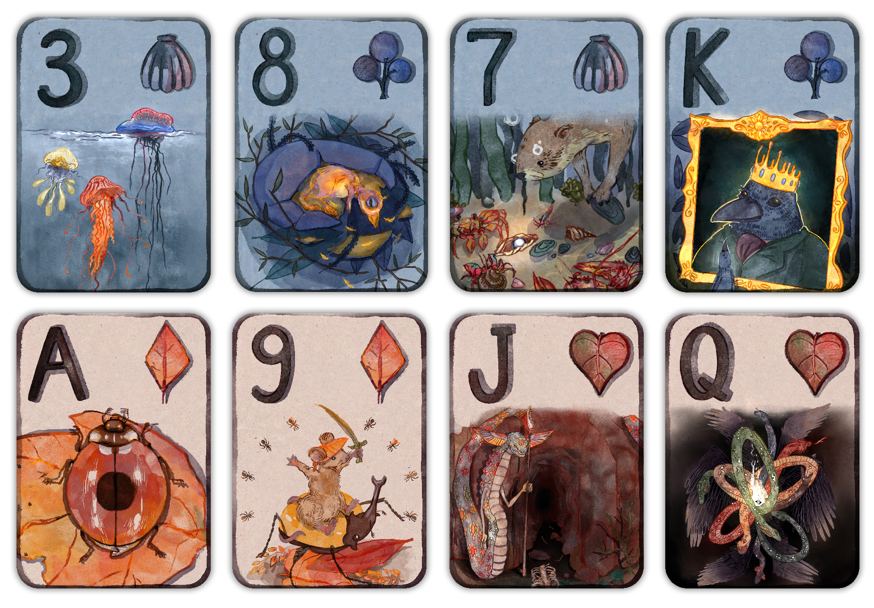 The deck draws on the visual traditions of classic European card games like Scopa and Swiss and Spanish suits, reimagined through Hanna’s organic, hand-painted lens.